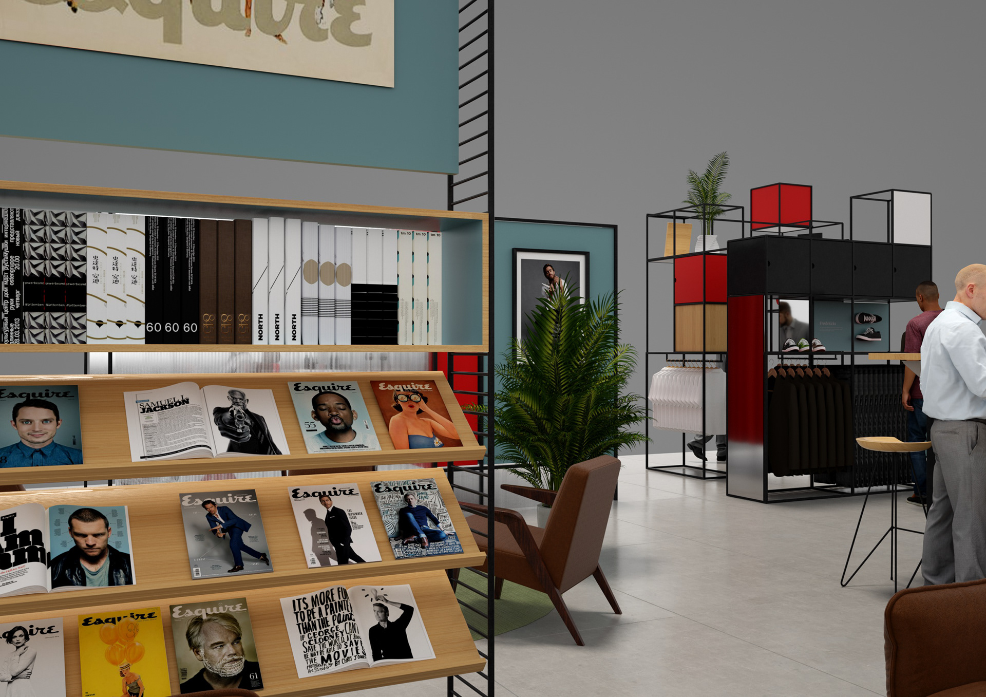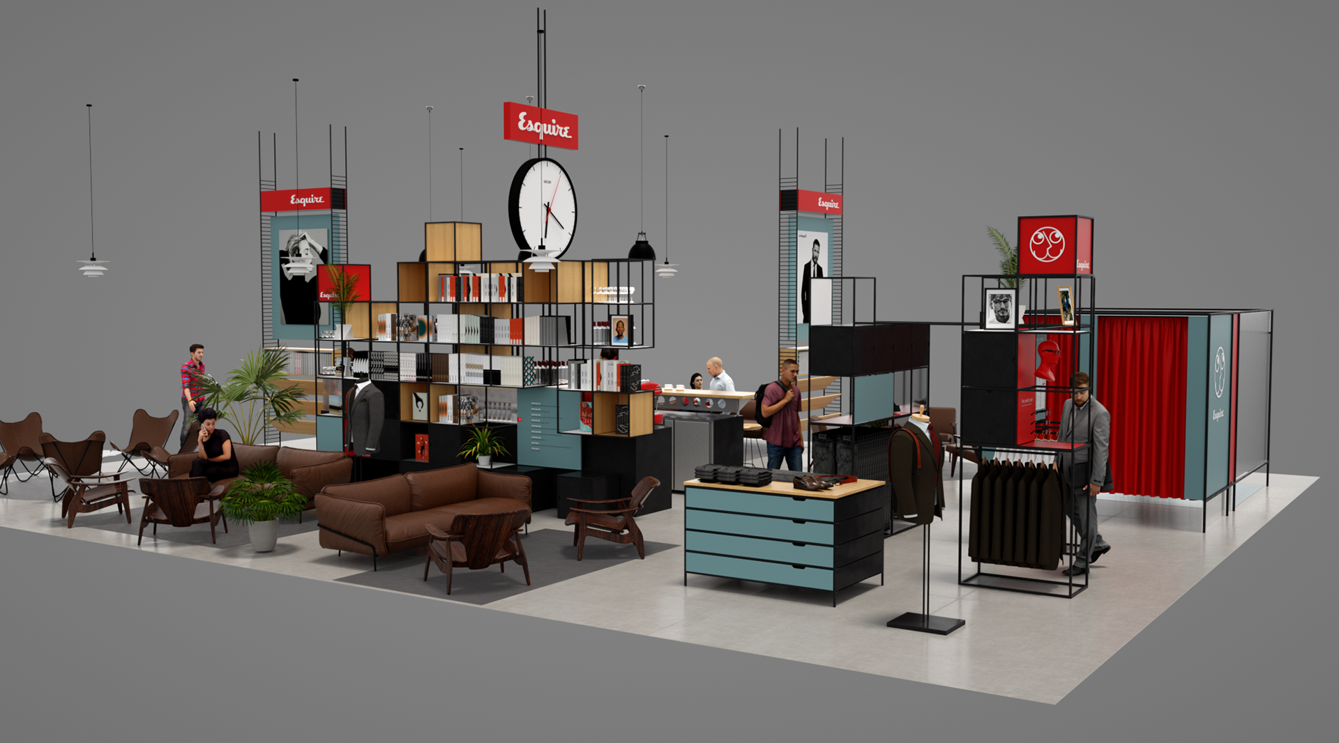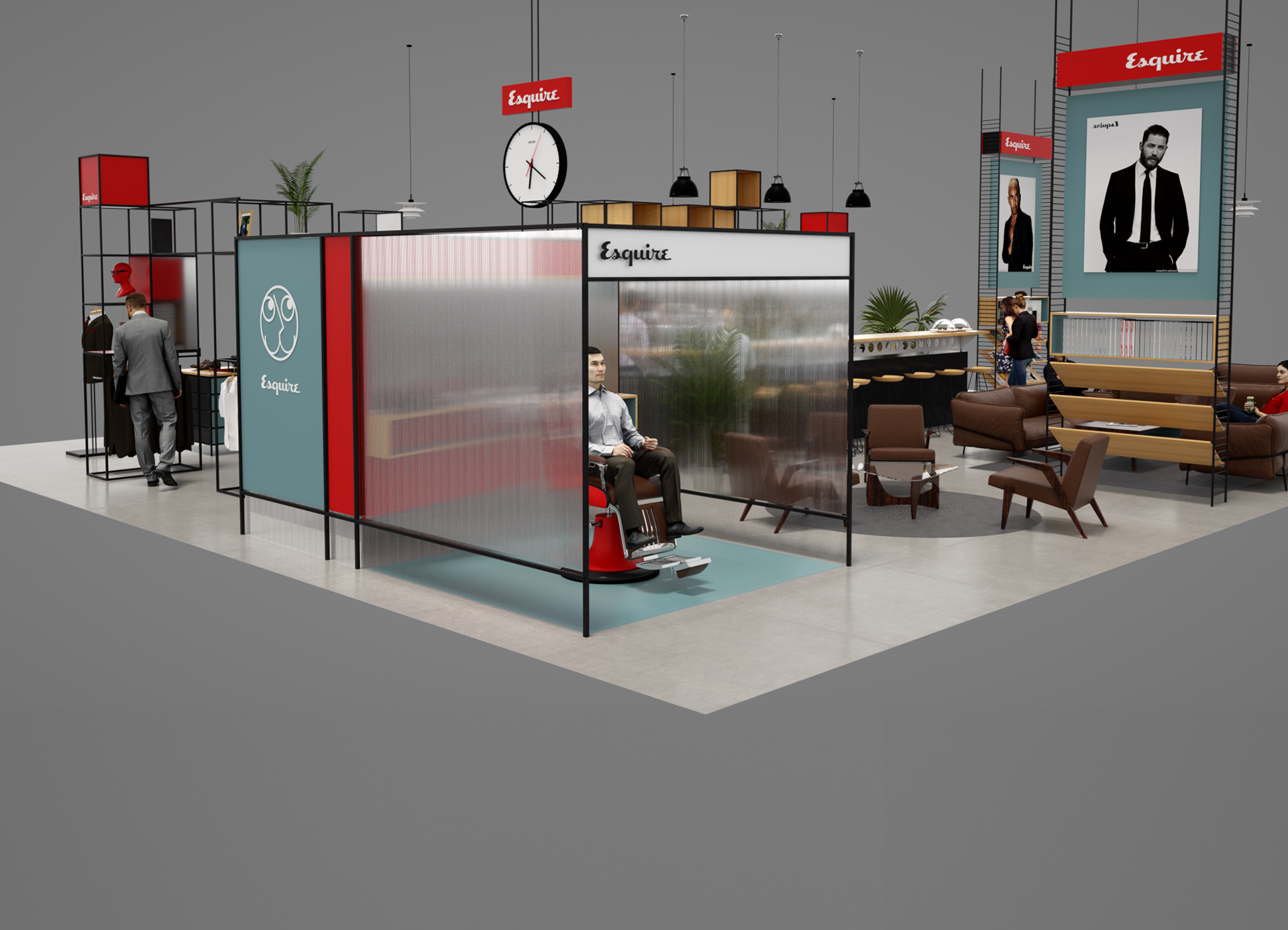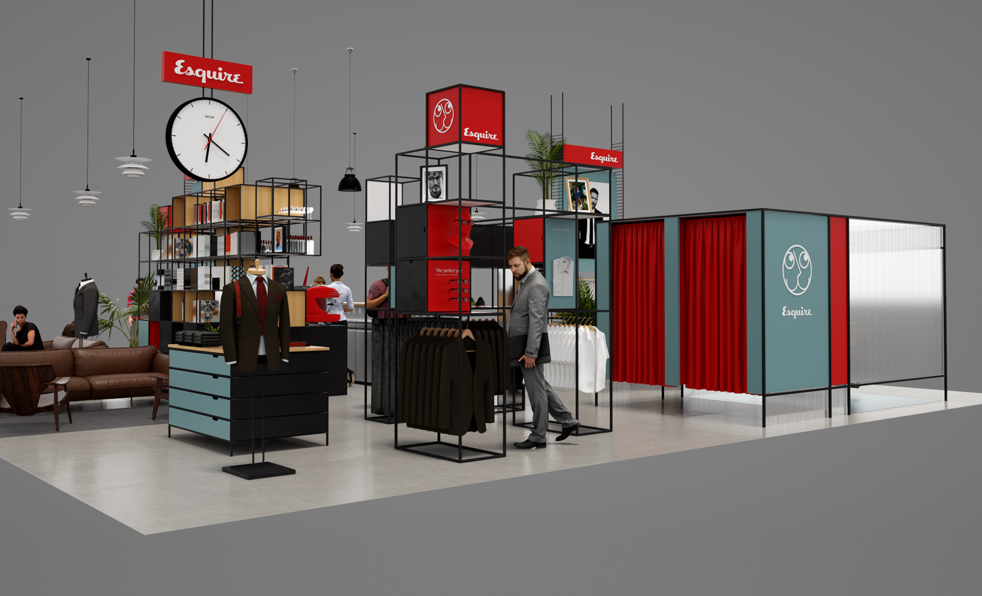 Esquire is a compendium of classic style for men this airport Pop-up aims to bring Esquire’s magazine and online presence to life utiliseing partnerships with other existing retail brands and online outlets. With a not to mid-century modern the much of the design utilises simple steel frame construction that can easily be adapted to different spaces.