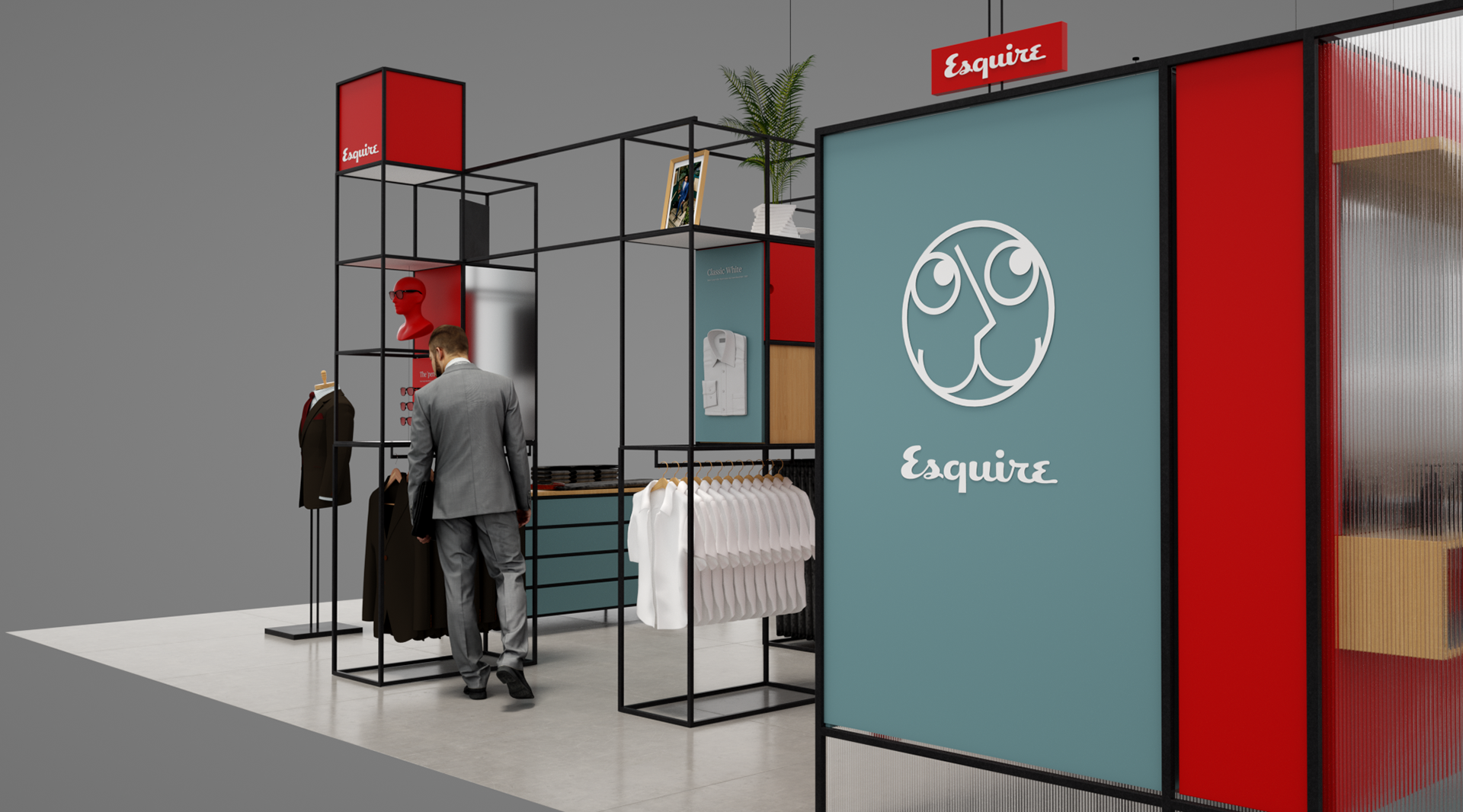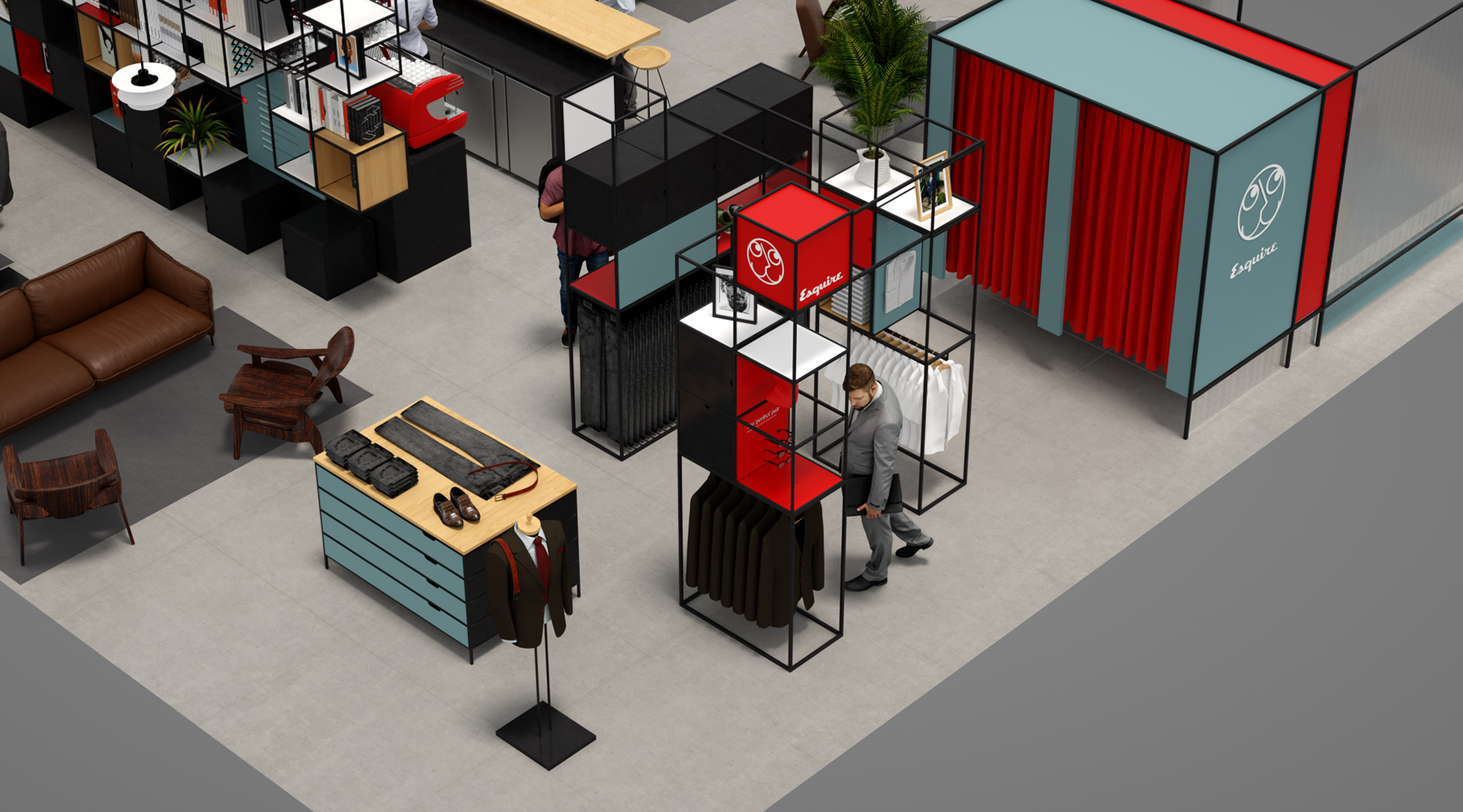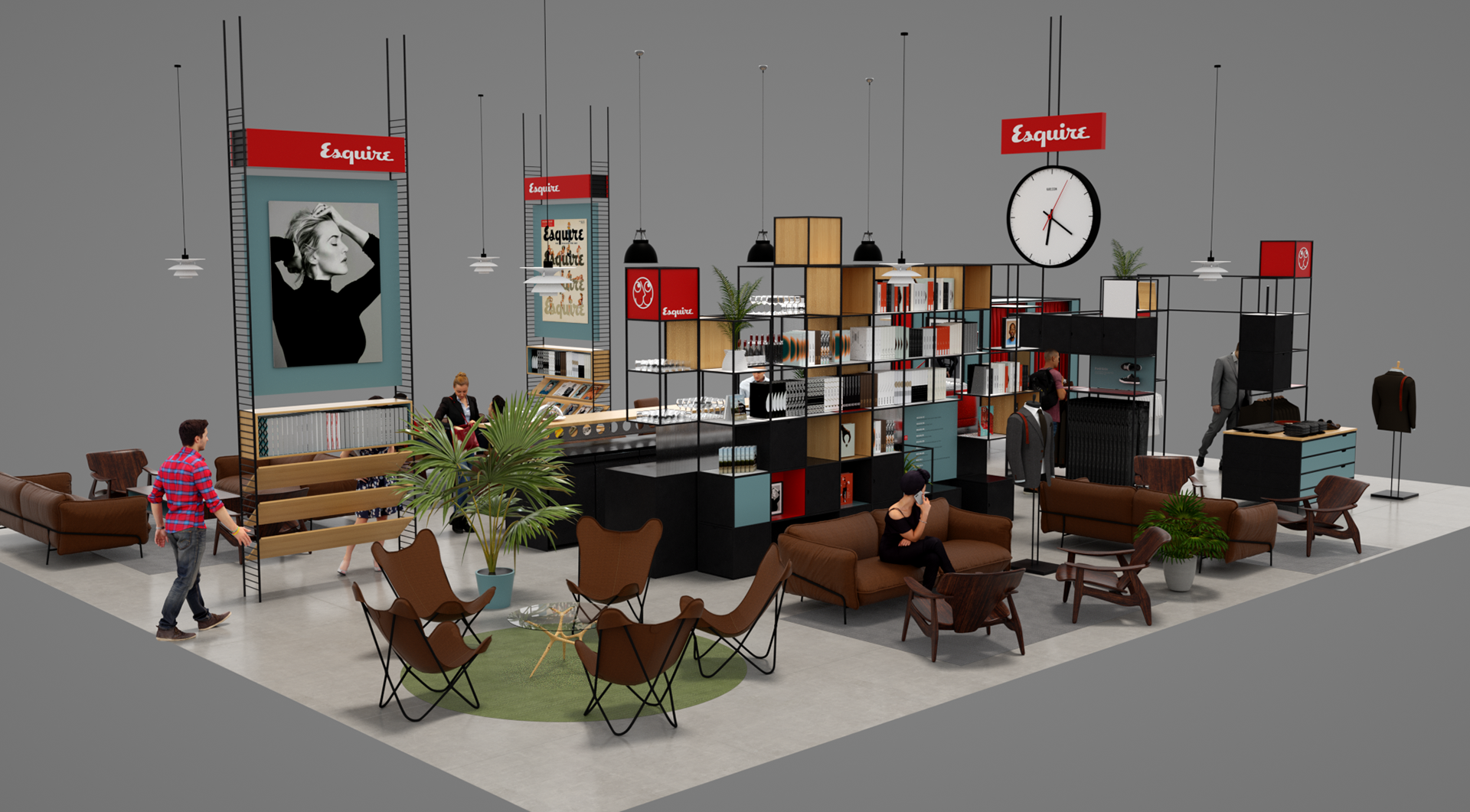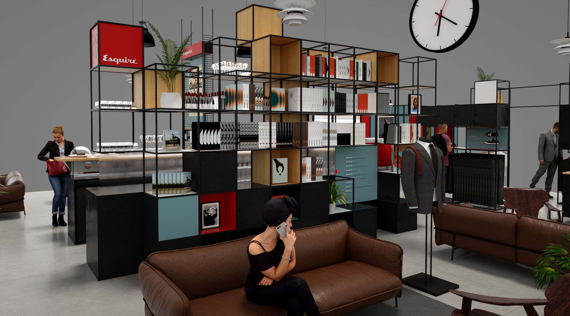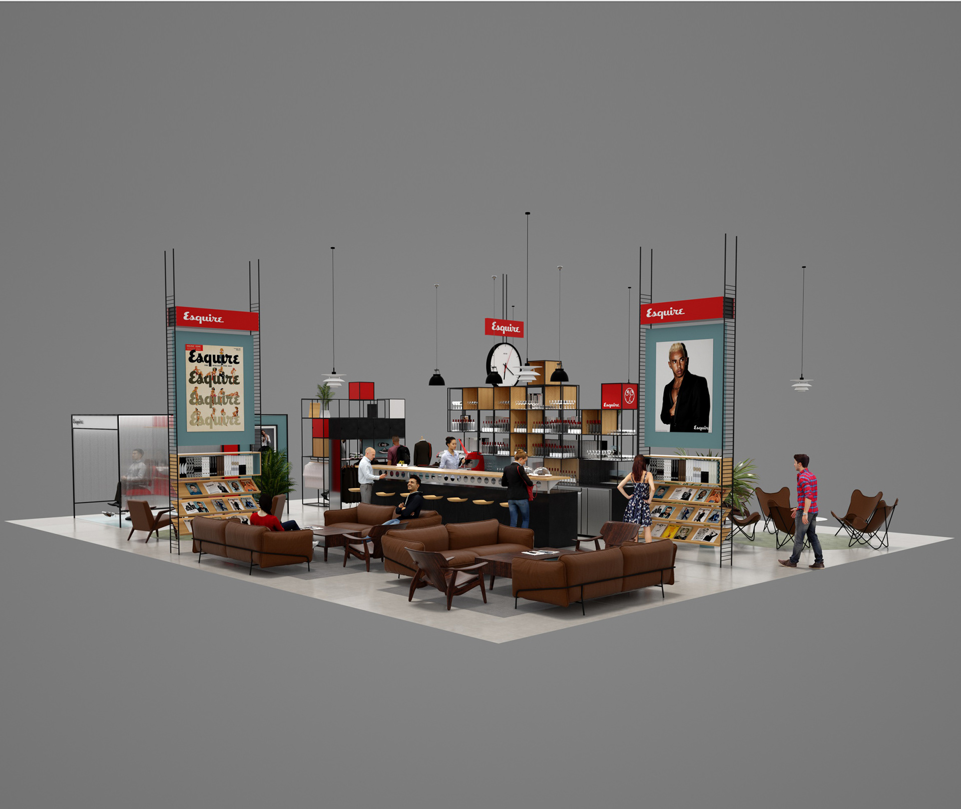 Esquire is a compendium of classic style for men this airport Pop-up aims to bring Esquire’s magazine and online presence to life utiliseing partnerships with other existing retail brands and online outlets. With a not to mid-century modern the much of the design utilises simple steel frame construction that can easily be adapted to different spaces.