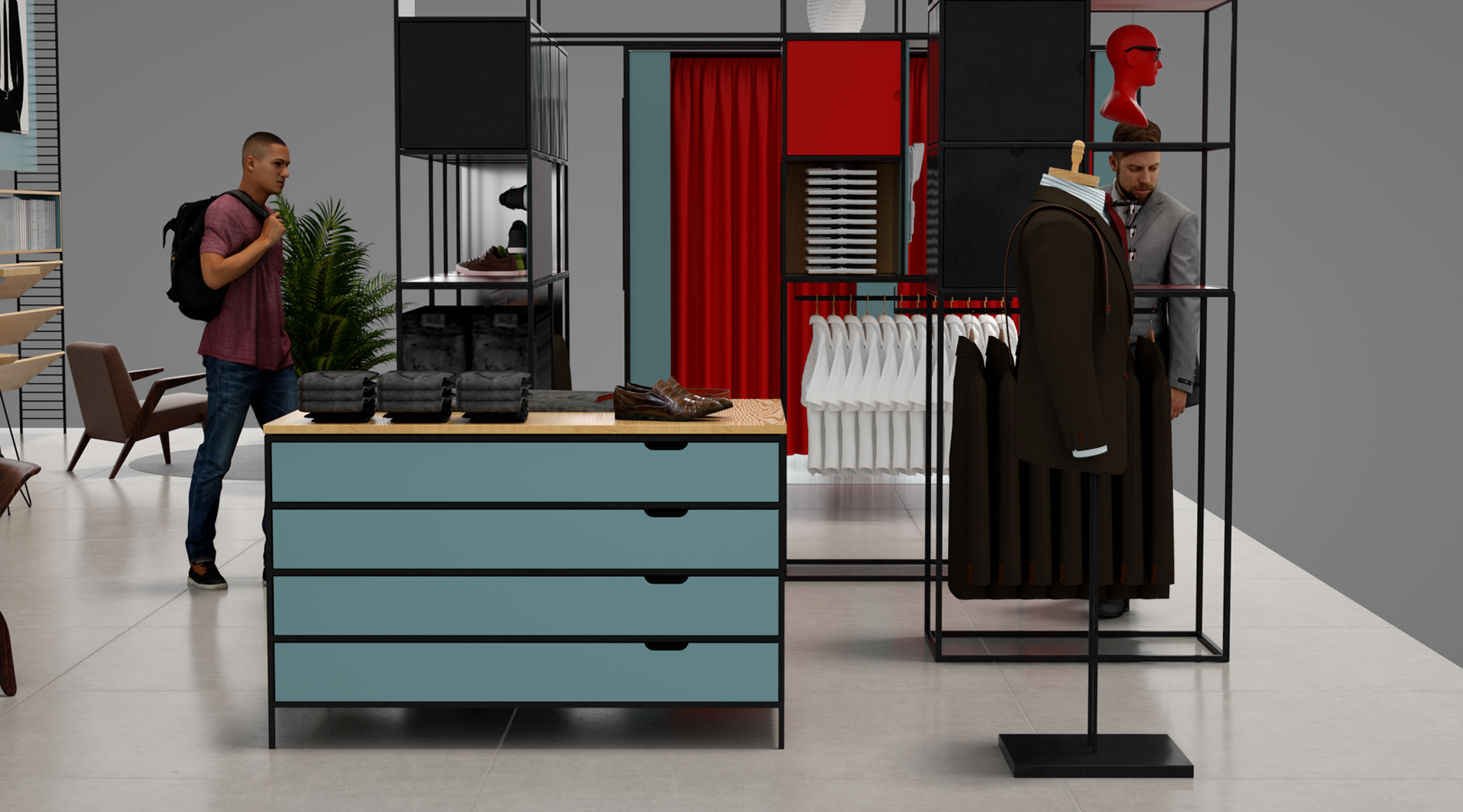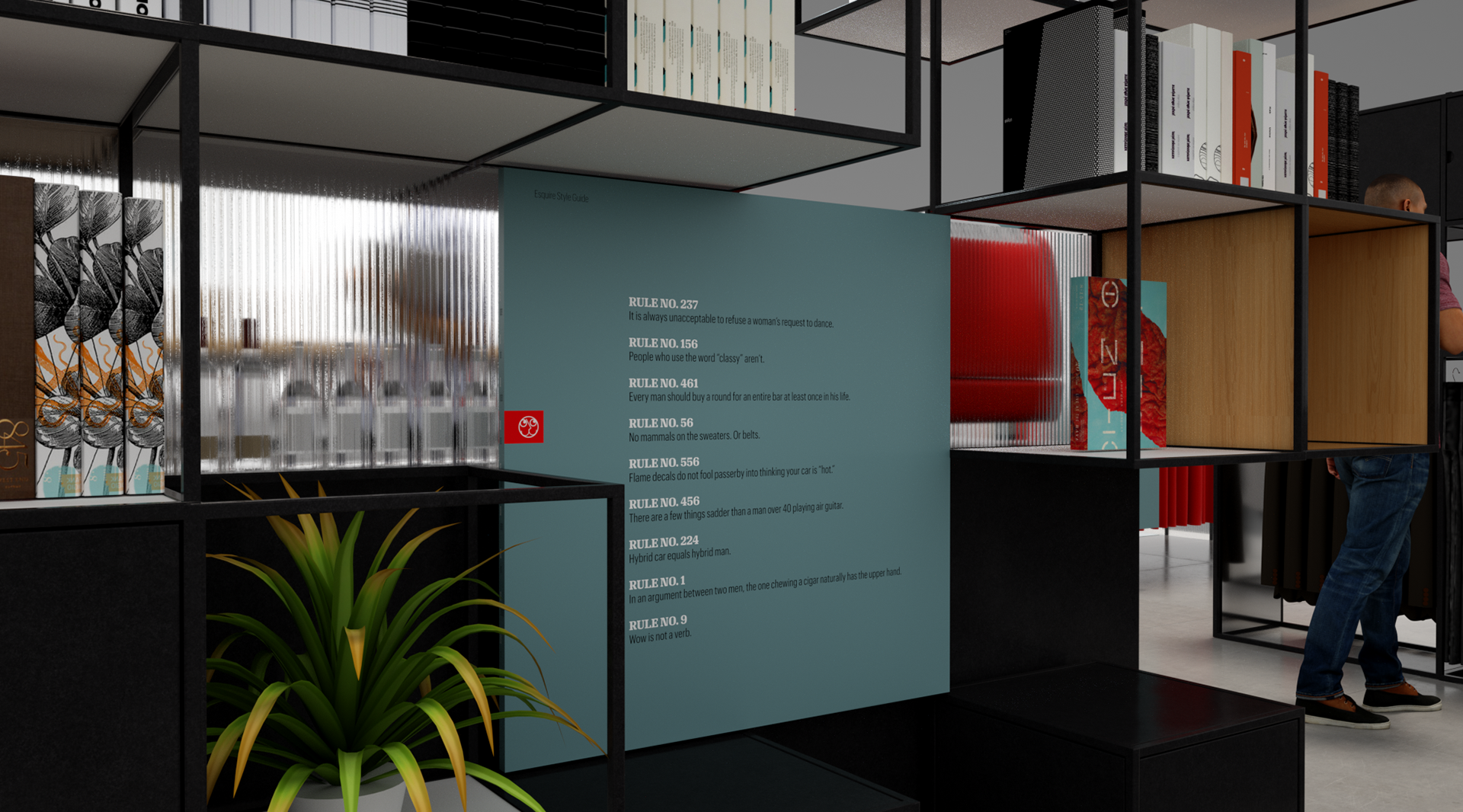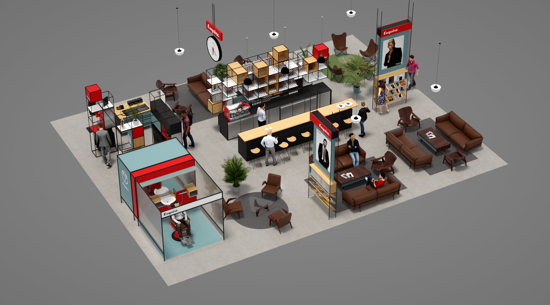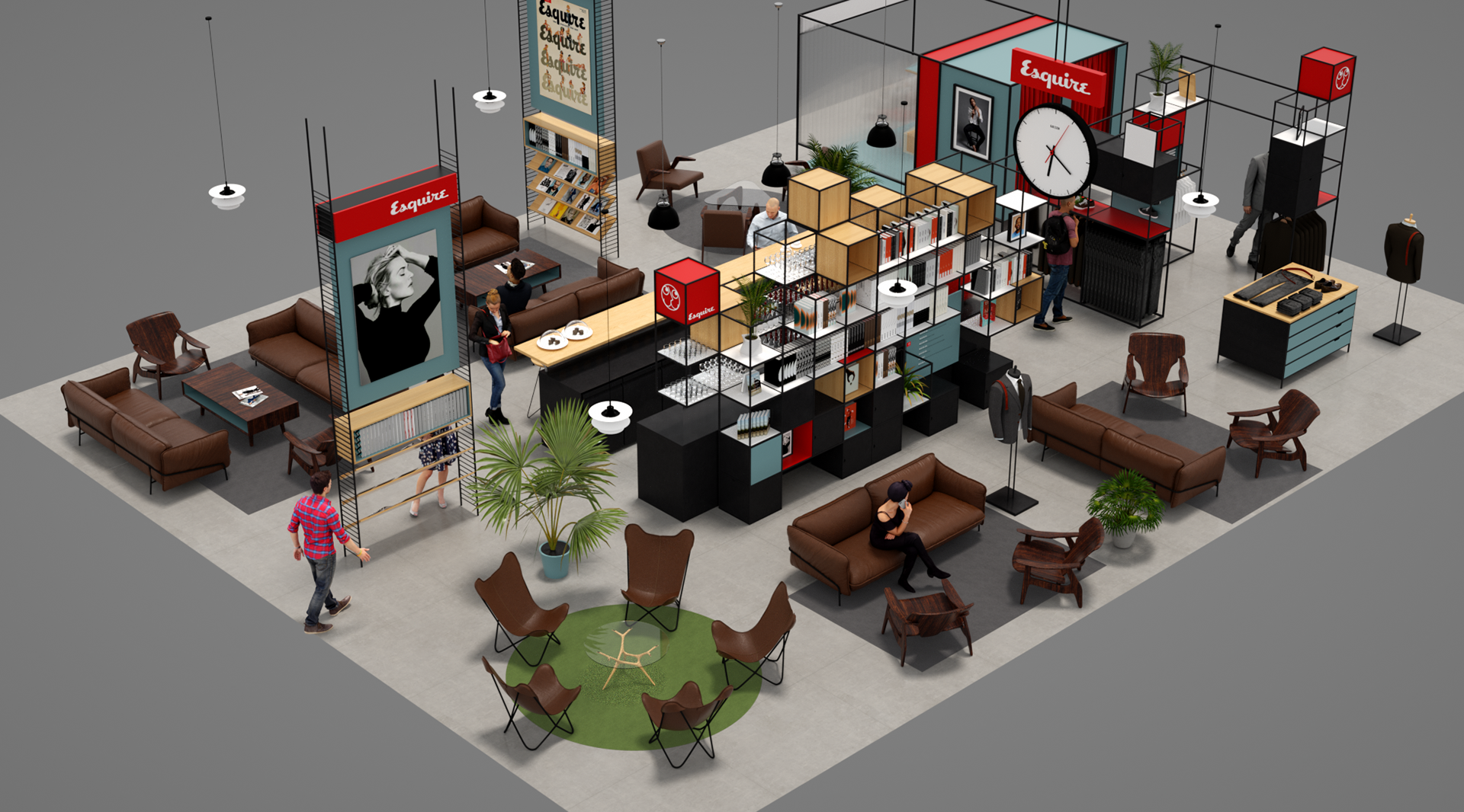 Esquire is a compendium of classic style for men this airport Pop-up aims to bring Esquire’s magazine and online presence to life utiliseing partnerships with other existing retail brands and online outlets. With a not to mid-century modern the much of the design utilises simple steel frame construction that can easily be adapted to different spaces.