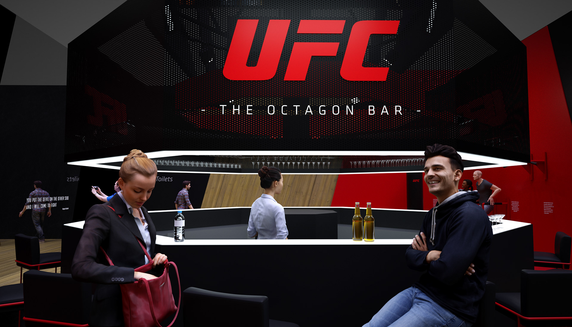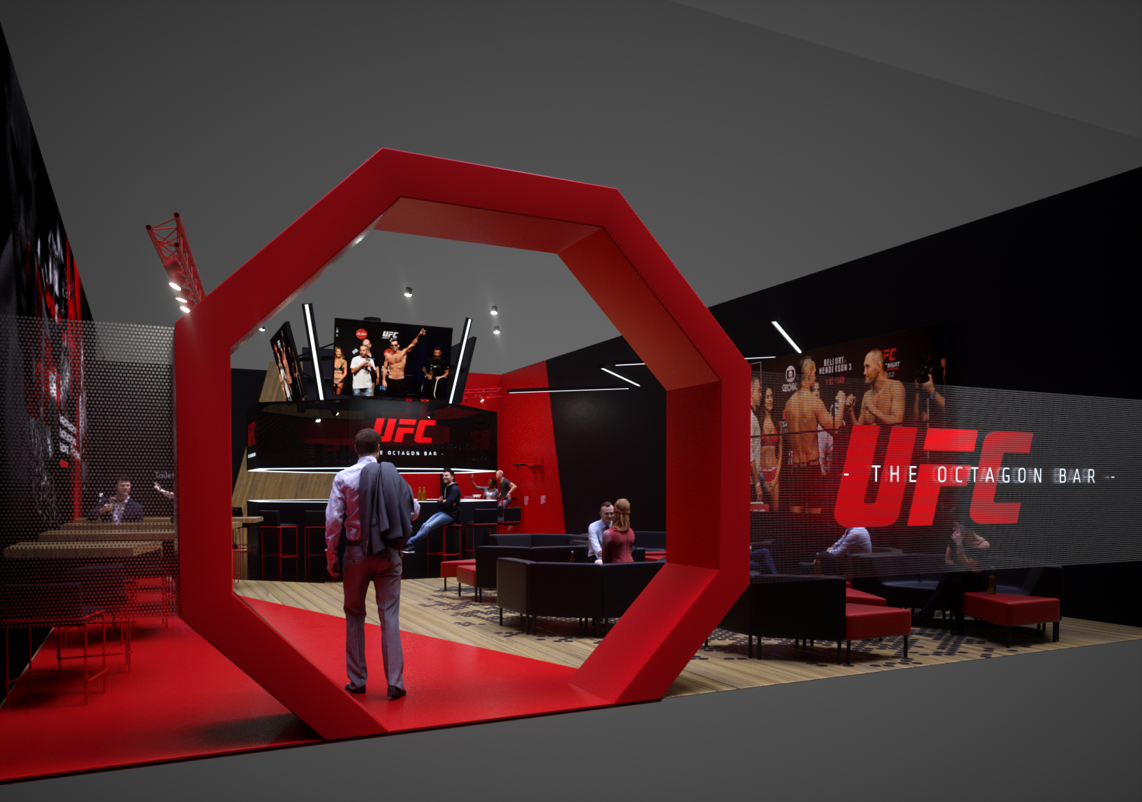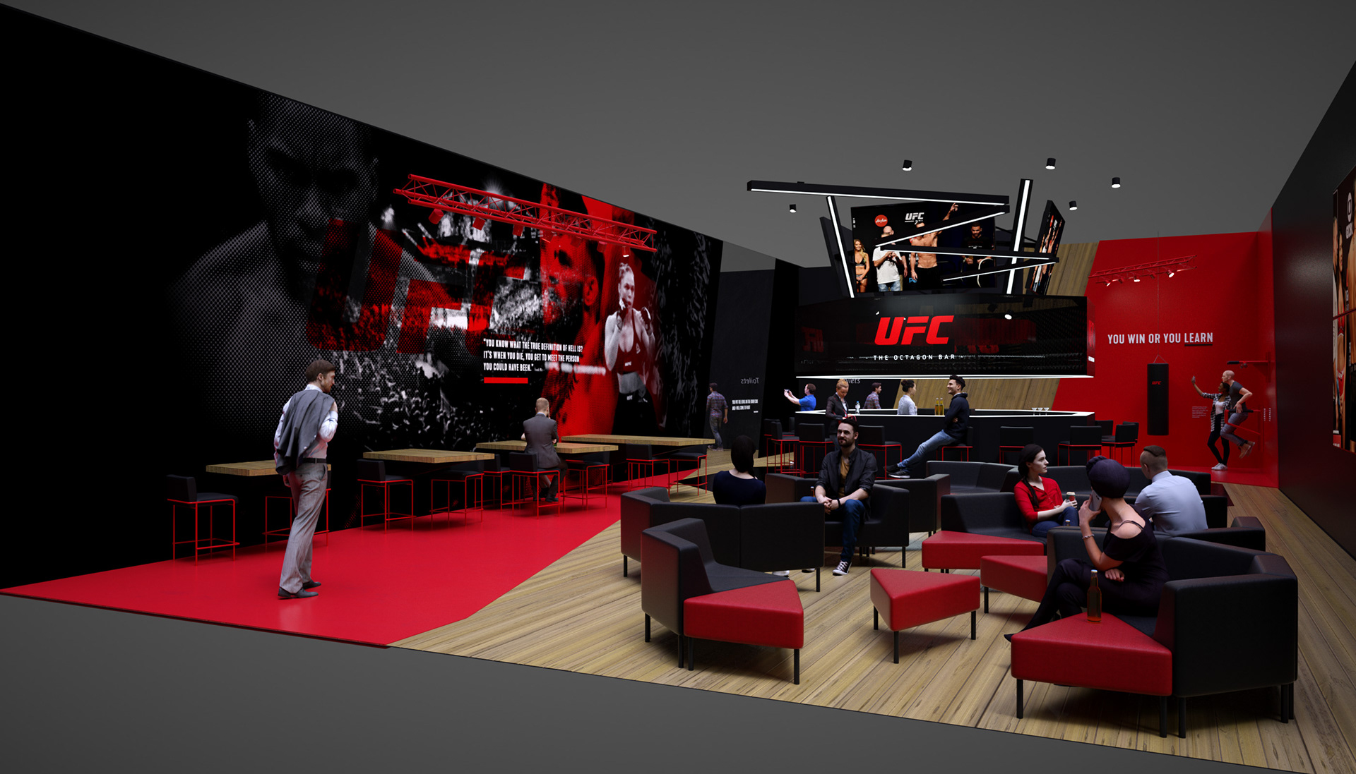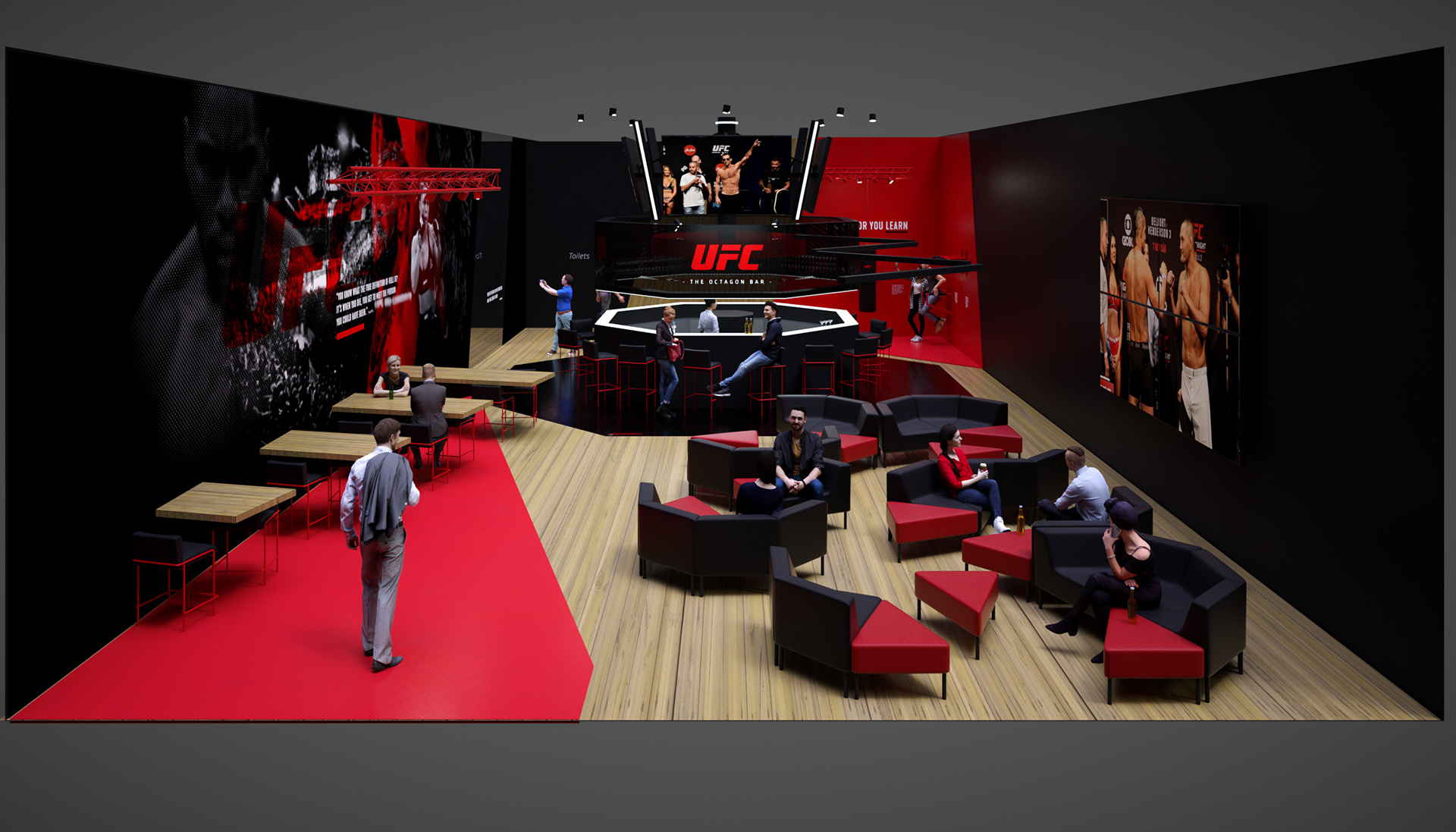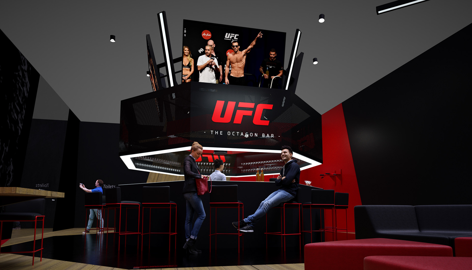 Famed for its octagonal ring and open approach to combat, the aim here was to create a space that visually reflects the dynamic nature of the sport. The approach aims to be flexible to adapt to different spaces, centering around a dynamically lit octagon bar and utilising modular furniture. The approach also includes a play/training space to encourage sharing via social media.
