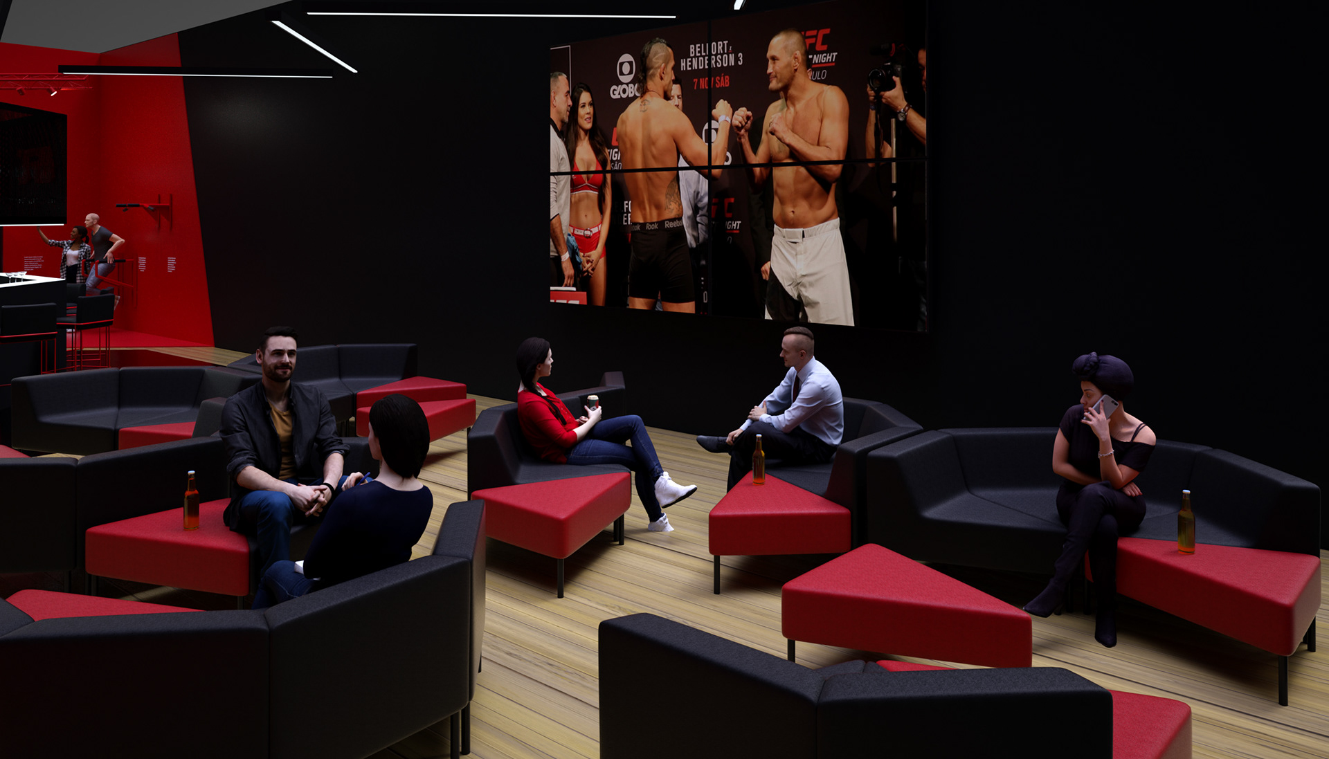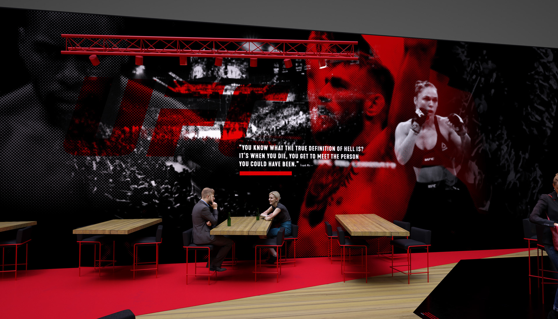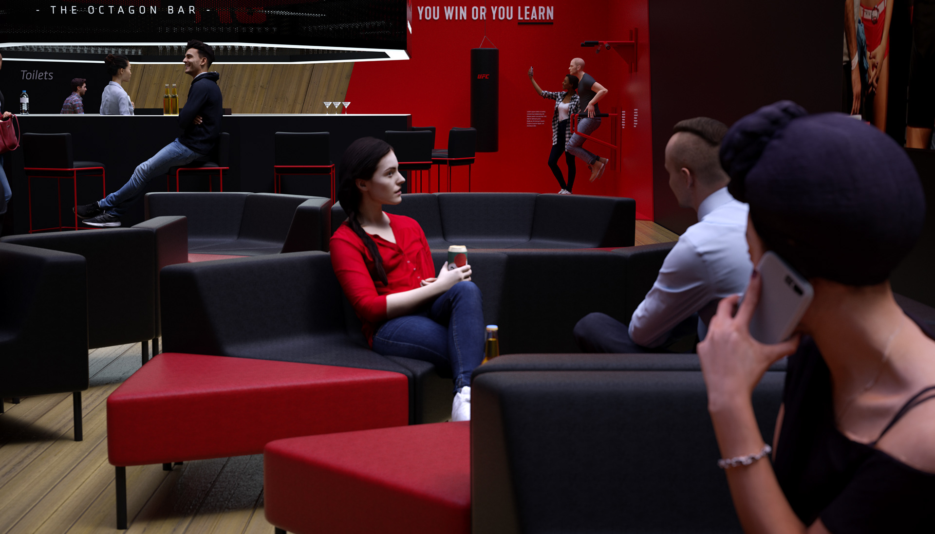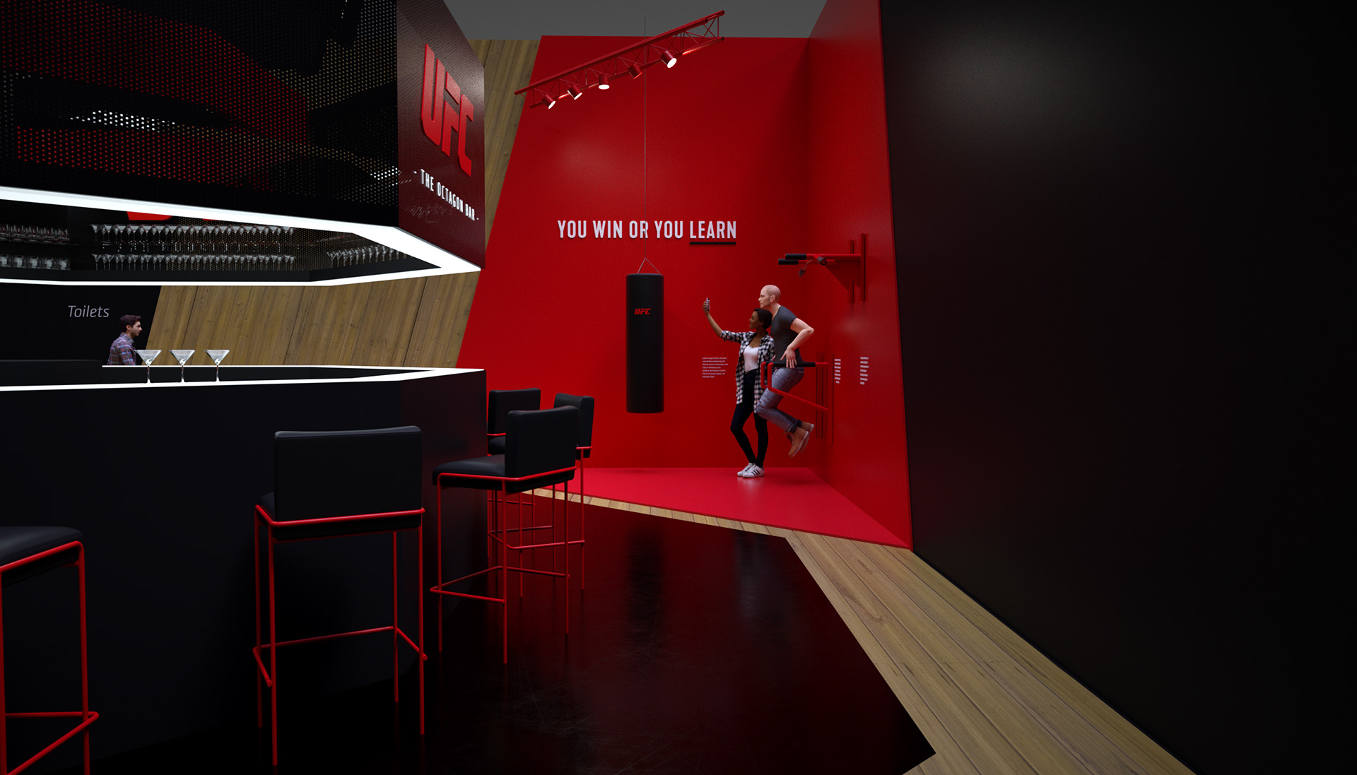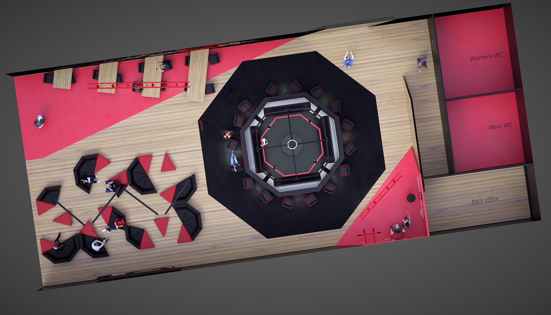 Famed for its octagonal ring and open approach to combat, the aim here was to create a space that visually reflects the dynamic nature of the sport. The approach aims to be flexible to adapt to different spaces, centering around a dynamically lit octagon bar and utilising modular furniture. The approach also includes a play/training space to encourage sharing via social media.