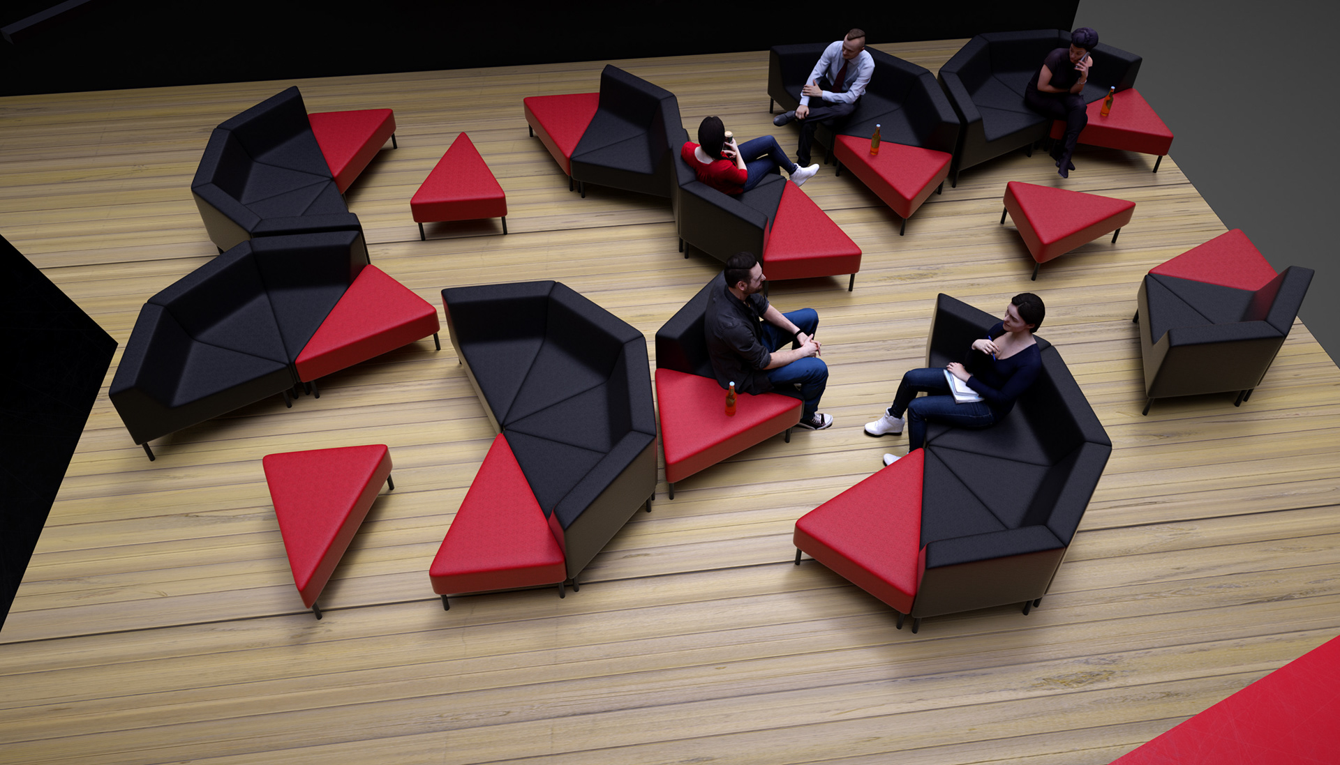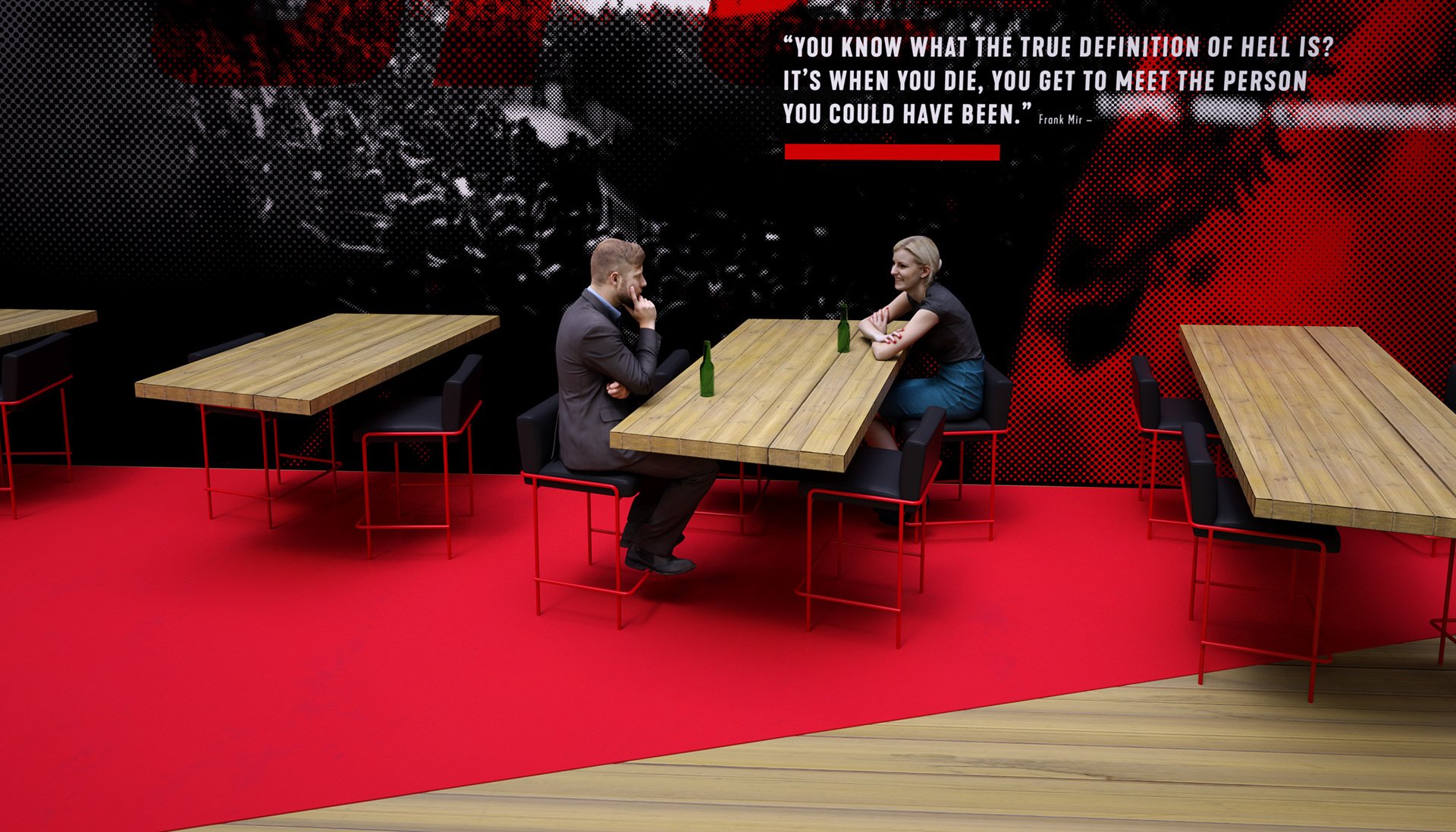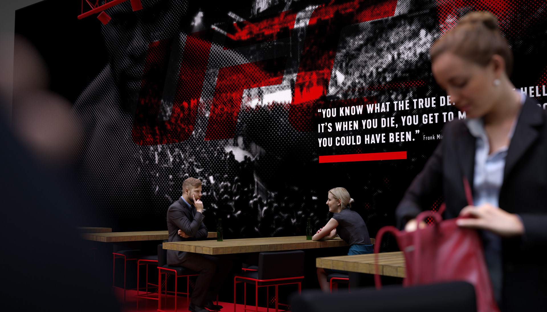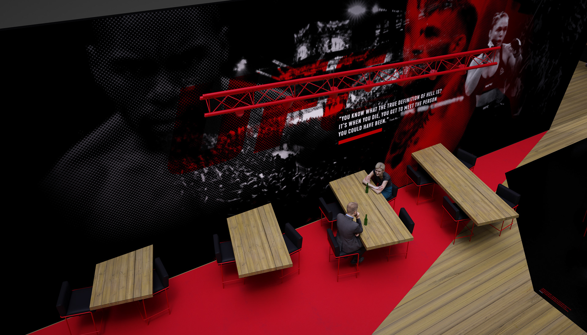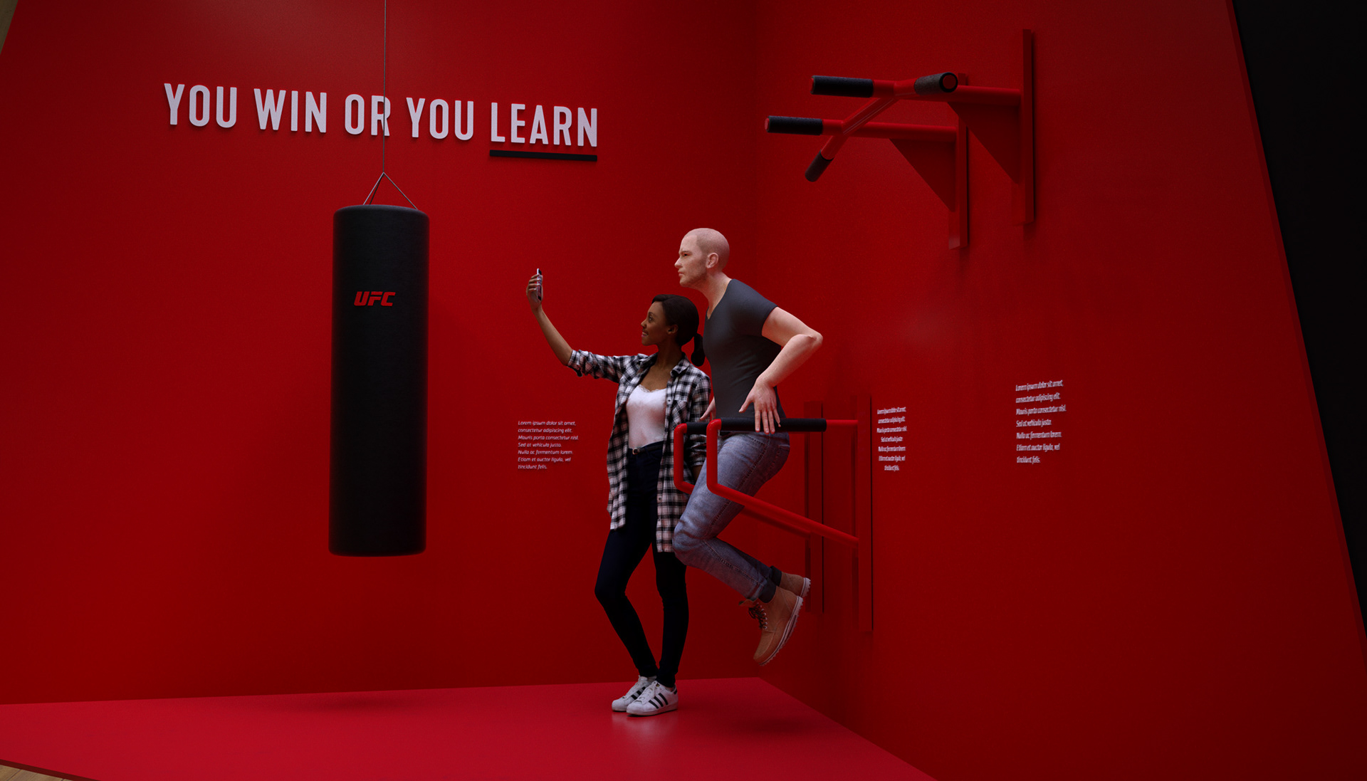 Famed for its octagonal ring and open approach to combat, the aim here was to create a space that visually reflects the dynamic nature of the sport. The approach aims to be flexible to adapt to different spaces, centering around a dynamically lit octagon bar and utilising modular furniture. The approach also includes a play/training space to encourage sharing via social media.