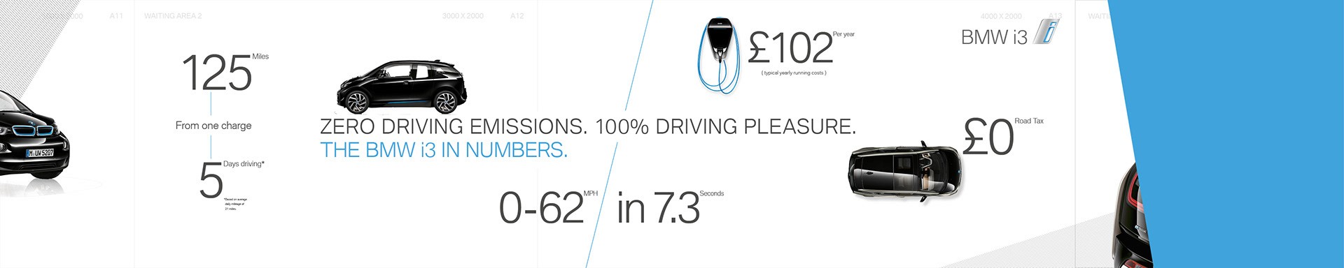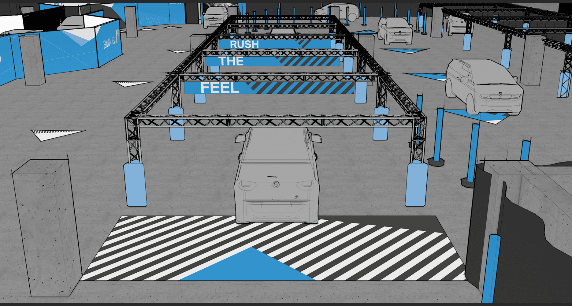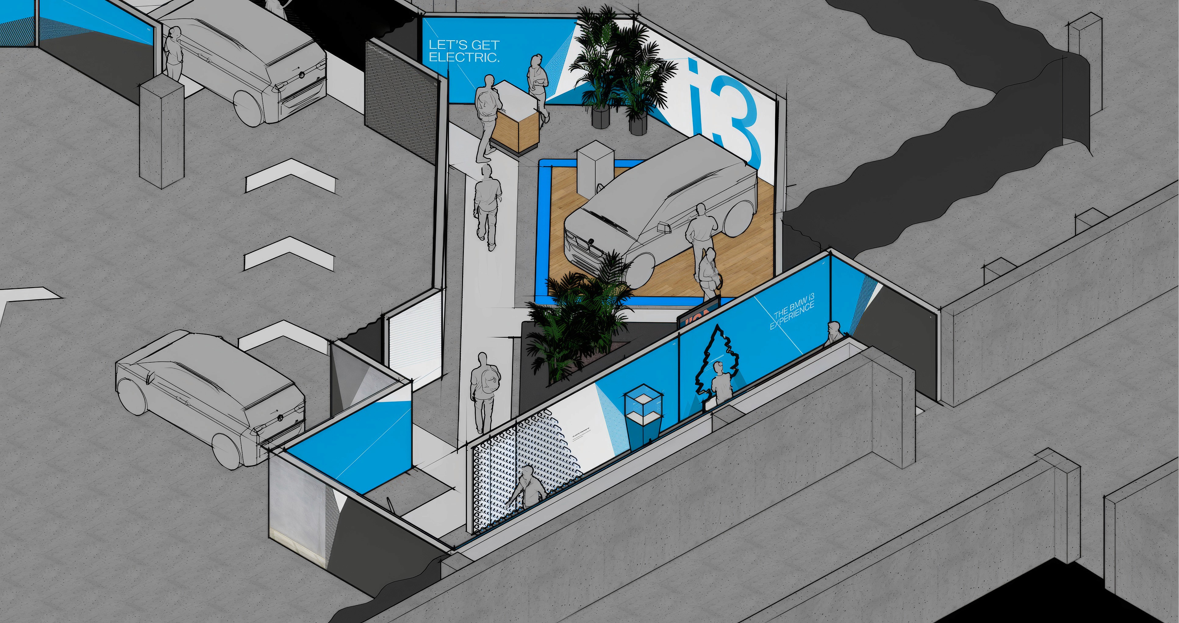 Created the visual and spatial design for BMW’s i3 experiential test-drive events, delivered in temporary car-park installations nationwide. Produced all event visualisation, panels, and environmental graphics to support a guided journey explaining EV technology through light, sound, materials, and driving experiences.